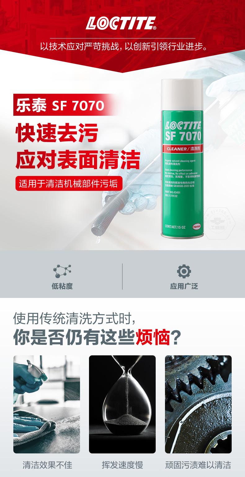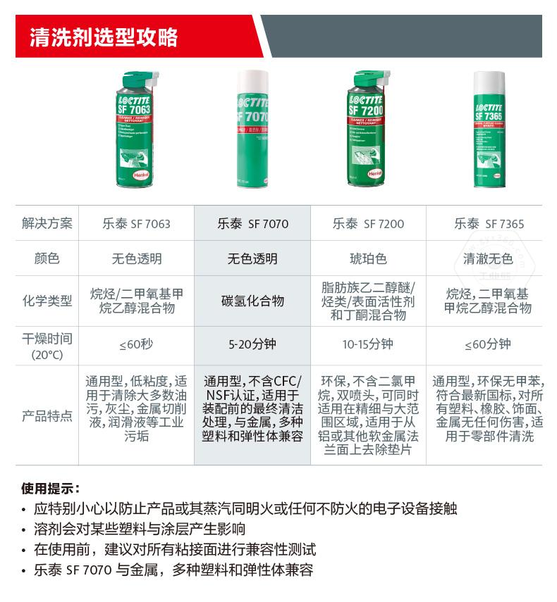 樂泰SF7070是一款溶劑型清洗劑。樂泰SF7070主打快速去污,適用于表面清潔和機械部件污垢清洗。樂泰SF7070無色透明,化學(xué)類型為碳?xì)浠衔铮?0℃下干燥時間為5-20分鐘,粘度非常低。樂泰SF7070具備快速揮發(fā)、應(yīng)用廣泛、強效清潔等特點,可用于裝配前的最終清潔處理。樂泰SF7070還與金屬、多種塑料和彈性體兼容。